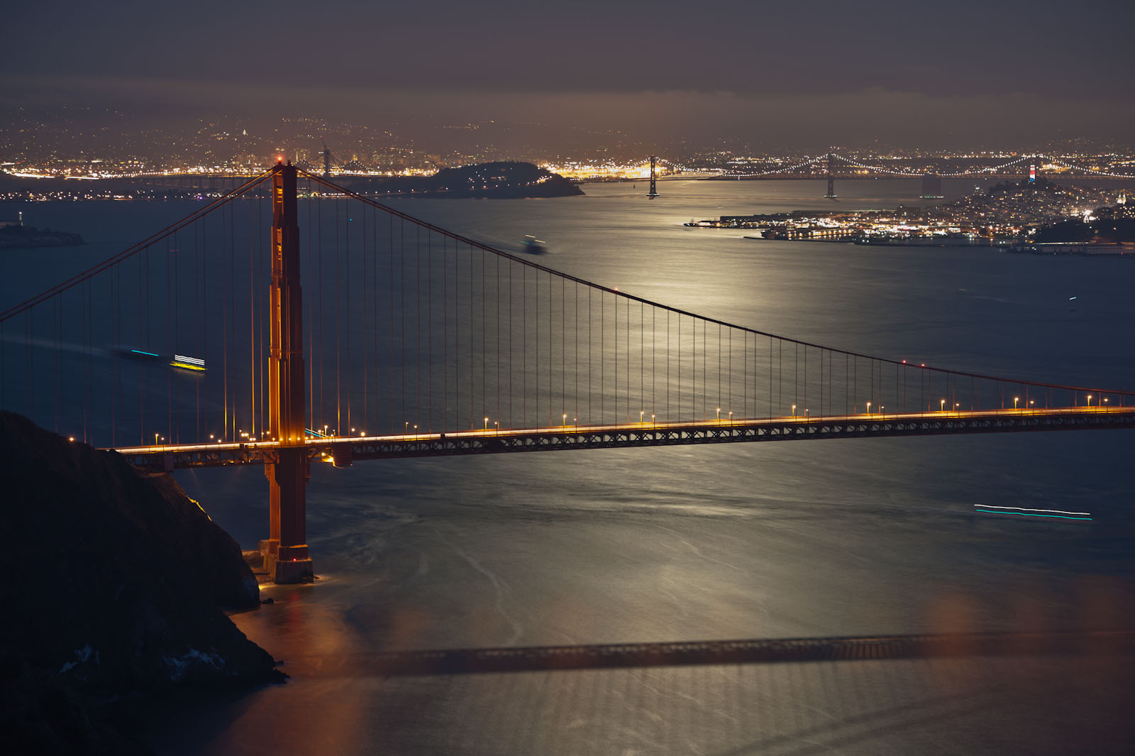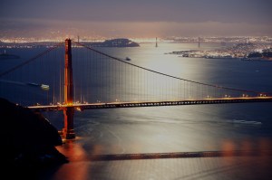 We start with the image below of the Golden Gate Bridge at night. Not only is the image generally overexposed, the highlights are completely blown out. Can we rescue this image? It’s easy to darken it overall, but what about those highlights?